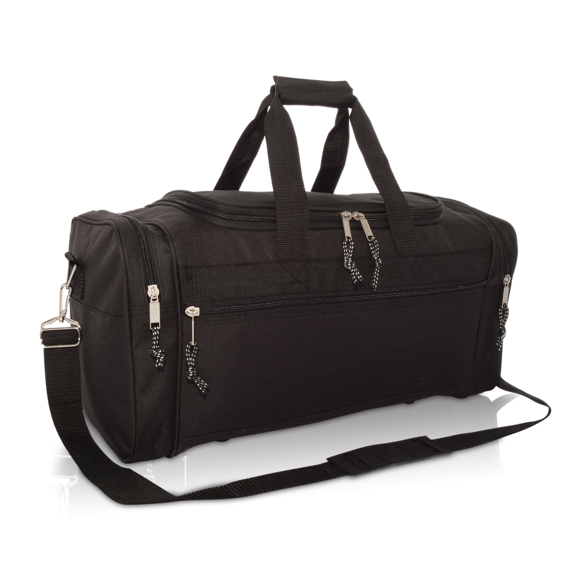 DALIX consistently reaches the pinnacle of affordable and useful everyday items. This is our 21" Duffel bag which has a top-entry Dual Zippered compartment for storage, along with that includes dual side zippered compartments for extra storage use of accessories, keys, water bottles, etc. Located on the front of the duffle bag is another Zippered compartment for storage of smaller accessories or documents to take with you. Included is straps with shoulder pads.