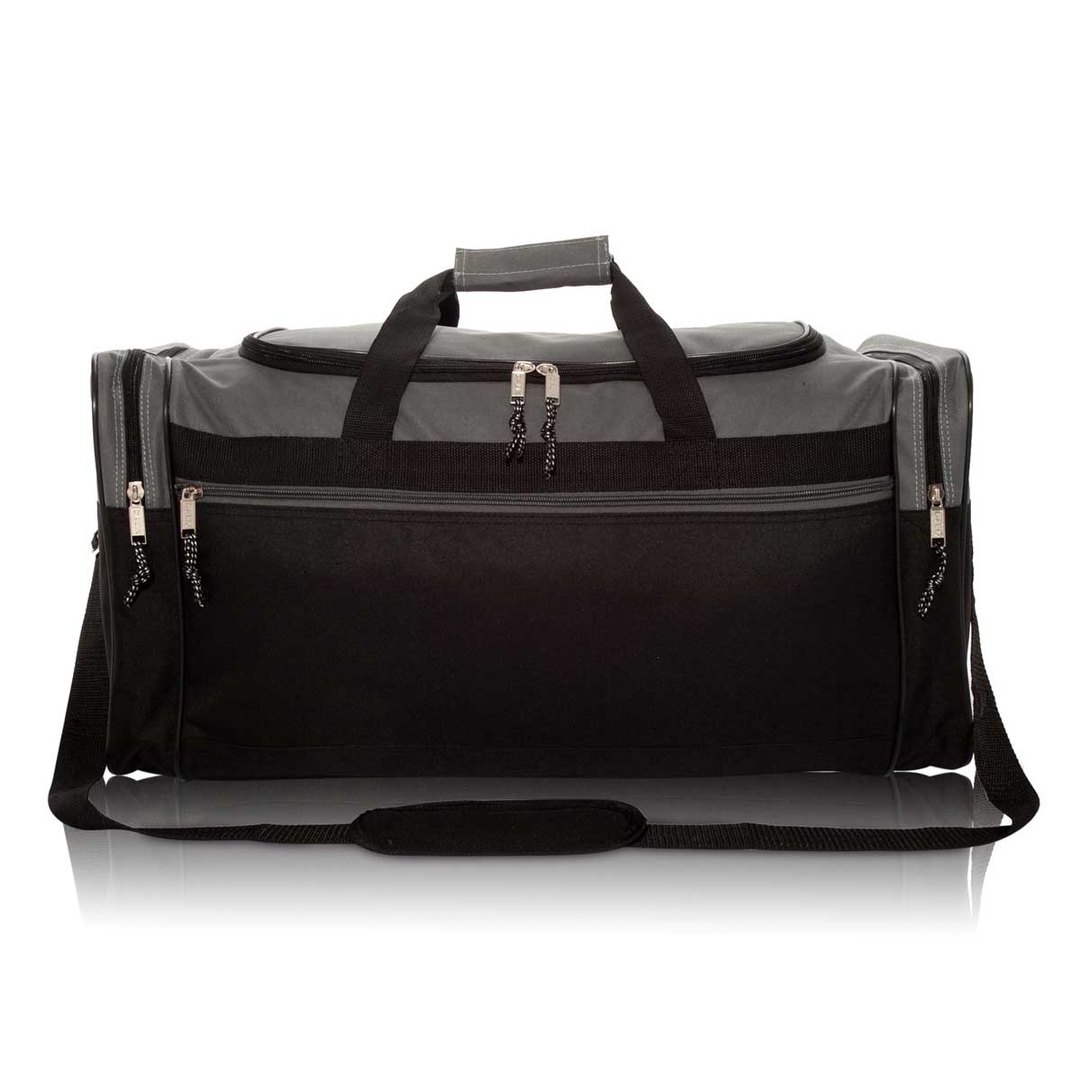 Take our new 25" Large Duffel bag model here with a Dual-Zippered 21" Main compartment to fit in sets of clothes, towels, shoes or other equipment to bring. On each side of the bag are 2.5" Deep Zippered pockets (12.5 x 11 x 2.5) which can carry separate accessories such as deodorants, keys, fresh towels, shirts.