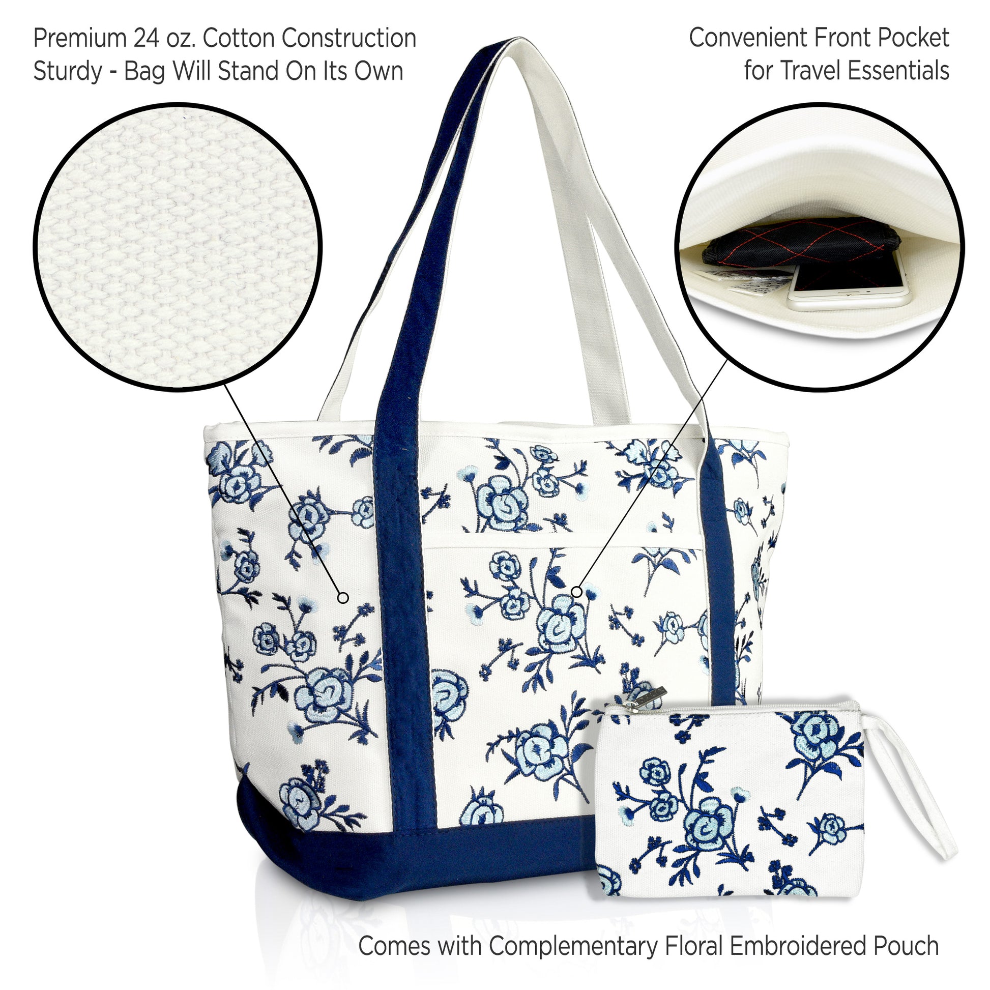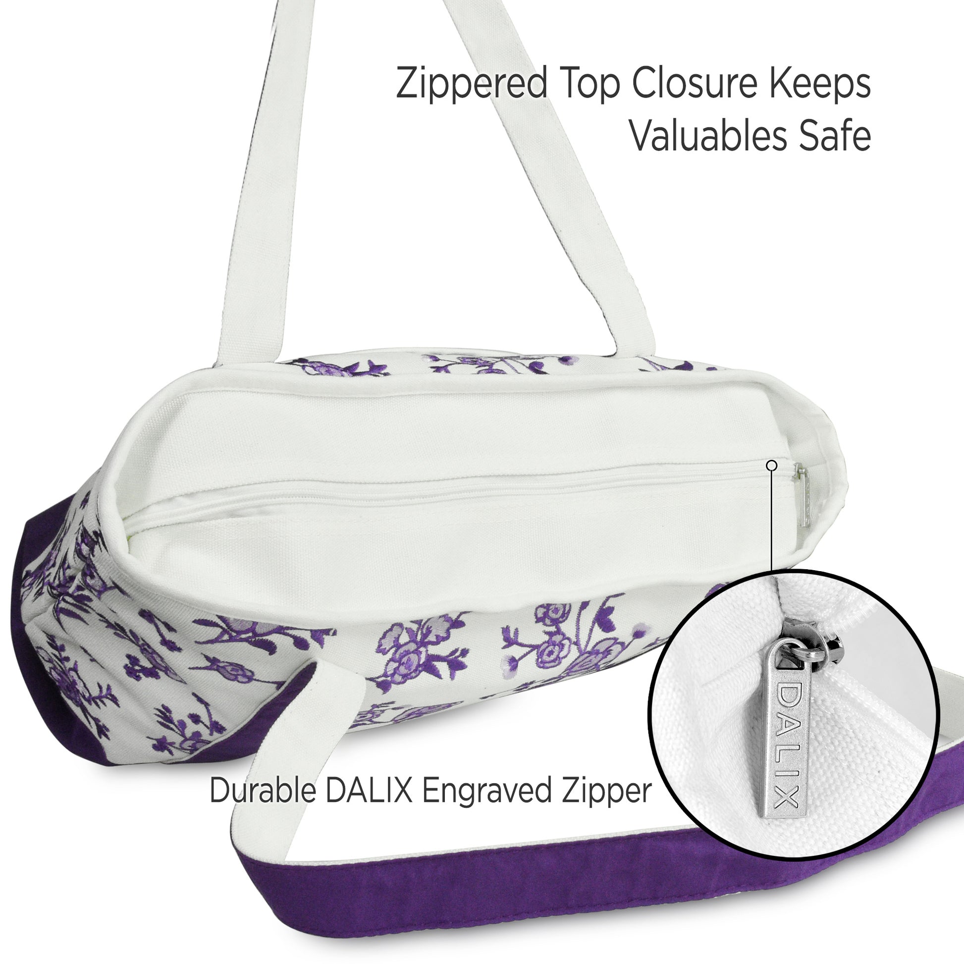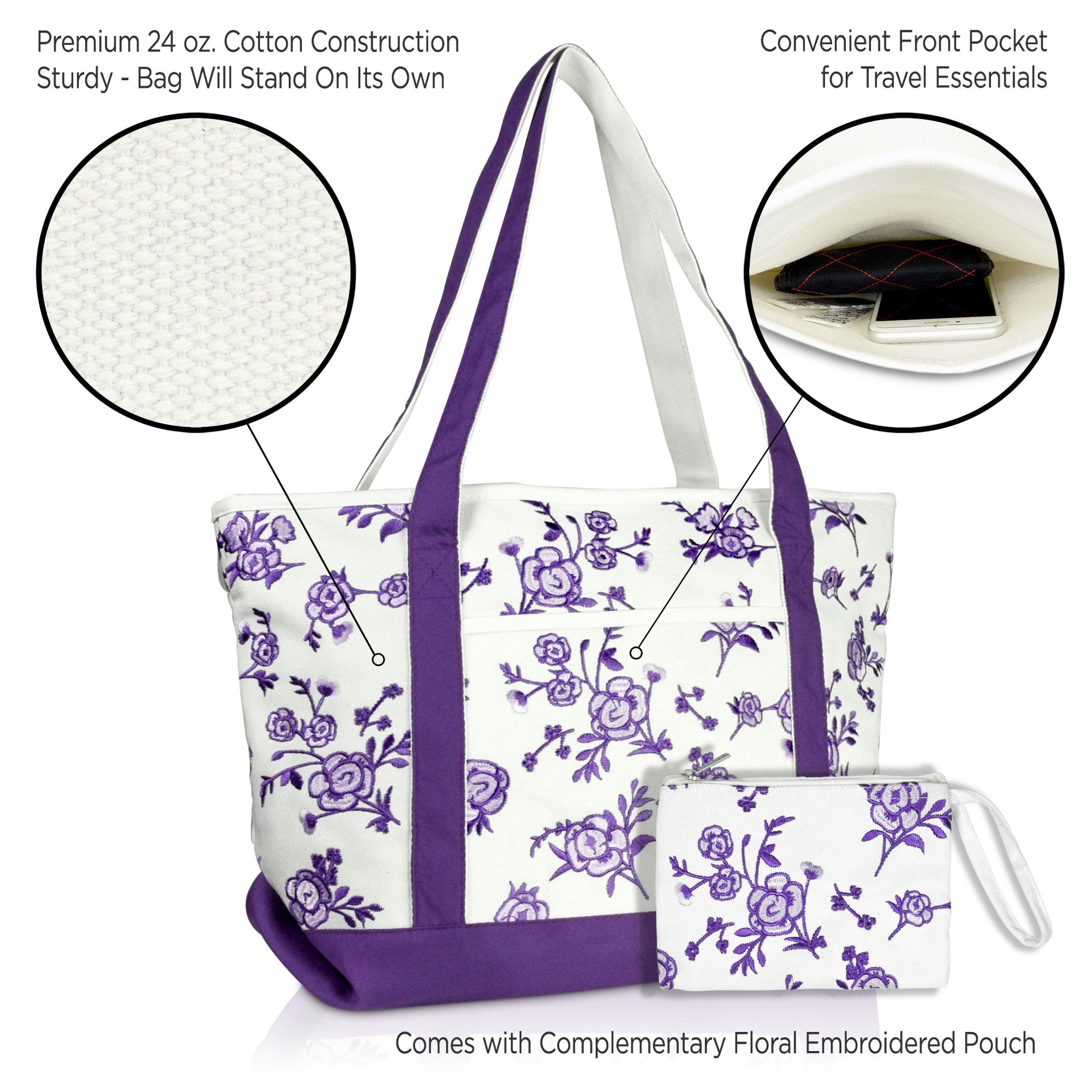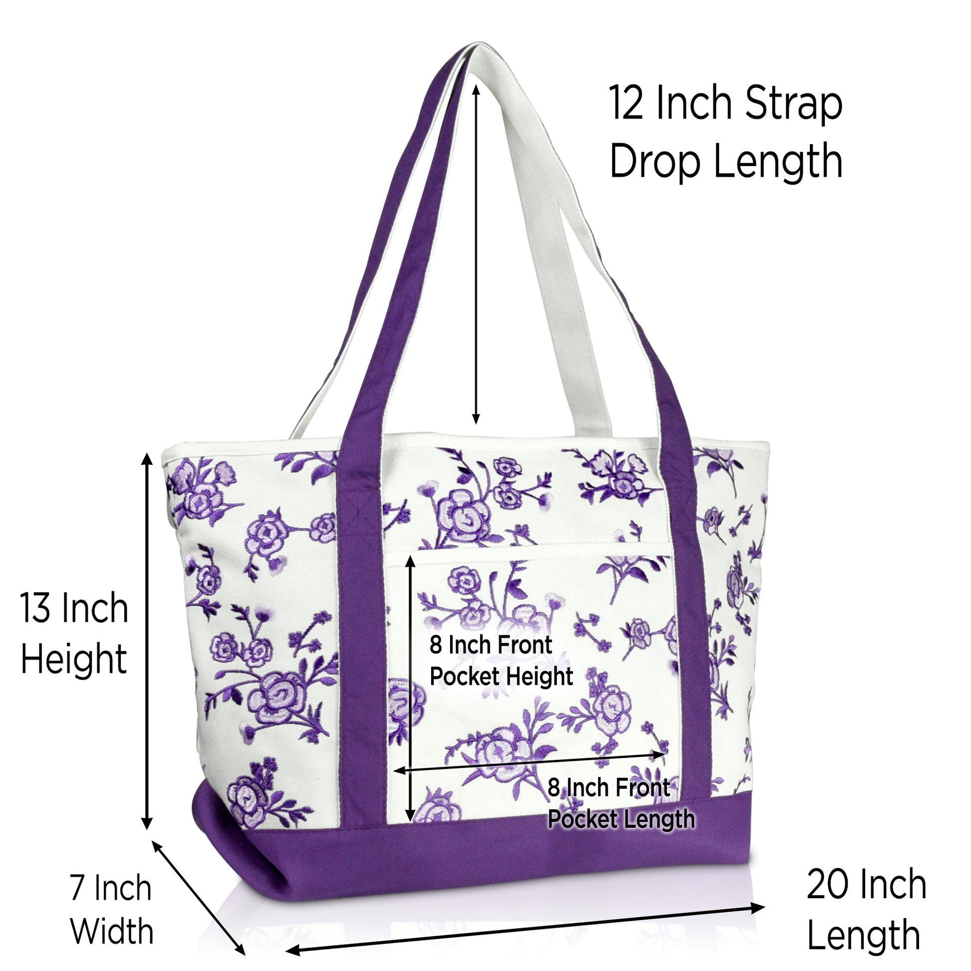 Our elegant floral tote Is the product of a fine evolution down a family line of DALIX canvas bags; resulting in a crossroads between beauty and quality. With its rich floral embroidery, blossoming with simple but extraordinary patterns, it brings the wearer into the limelight. It is perfectly suitable for a day out shopping, running errands, or visiting loved ones while affording the space for all your necessities. Not only is this tote bag light weight, it is made with a premium 100% cotton canvas (24 oz.) to withstand heavier weight and maintain its structured rigidness; allowing it to stand upright. For extra support, we have added double stitching on each strap to outlast your every use; or In the case you do end up packing more on the go, its soft straps have a 12 inch drop-length which makes this an elegant shoulder bag. The main compartment (20 inches Length x 7 inch Depth x 13 Inch Height) is generously spaced to fit all your items: featuring a soft 100% cotton inner lining to keep your items protected and clean. To help avoid the clustering disarray of all your things being stuffed in one compartment, the tote features an inner zippered pocket (7 inches Height x 6 inches Width) for valuables and keys, and we've also included a carrying pouch to help you keep organized. The carrying pouch, which displays an exquisite floral embroidery, is detachable from an inner lobster clasp keychain strap in the main compartment. And for your items' safekeeping, we've closed off the top with a fine zippered lining: smooth and easy to pull. There is also an outer front pocket compartment (8.5 inches Width x 7.5 inches Height) for easy grab-and-go storage. This tote bag is made for the everyday woman looking to enhance her wardrobe with a simplistic touch of elegance.