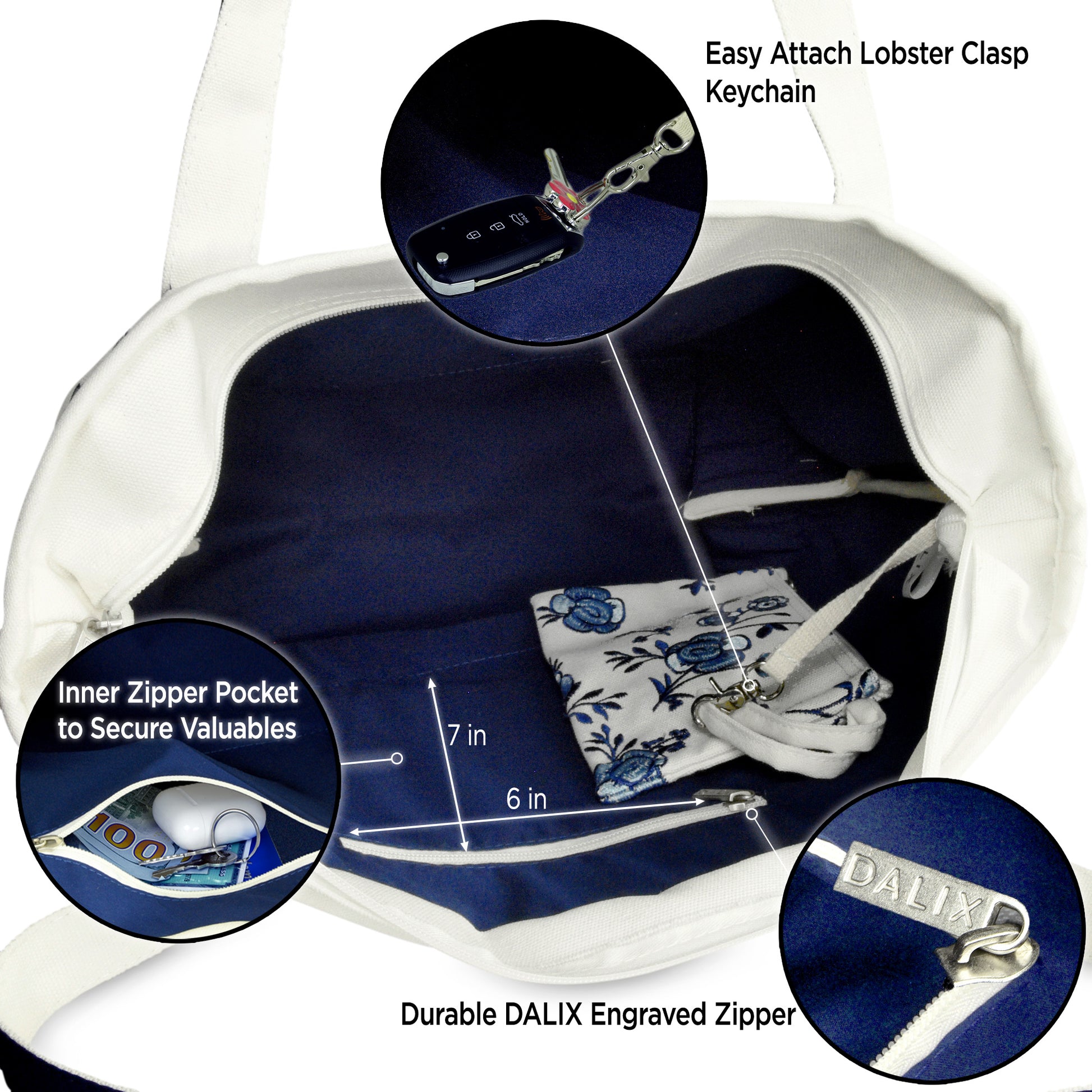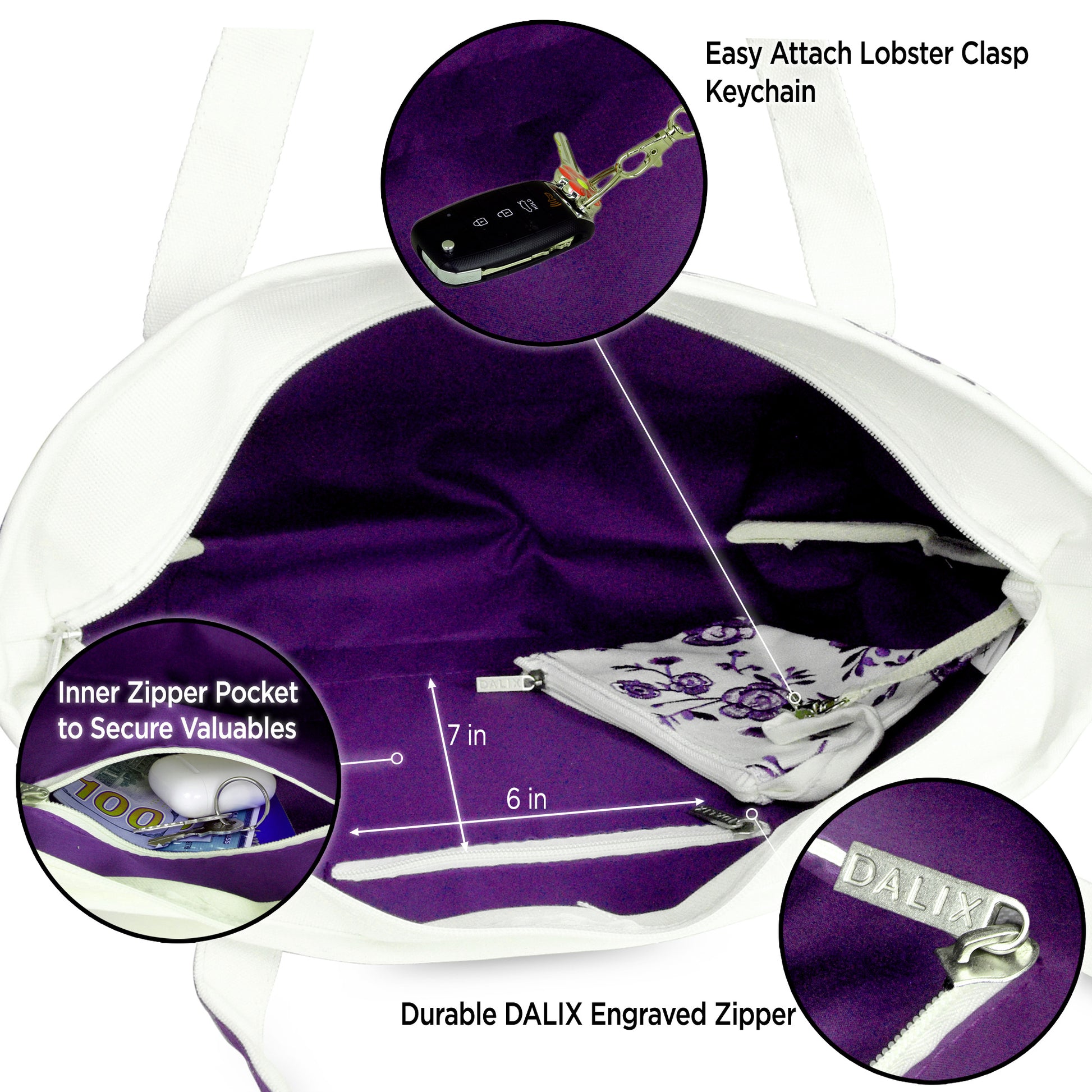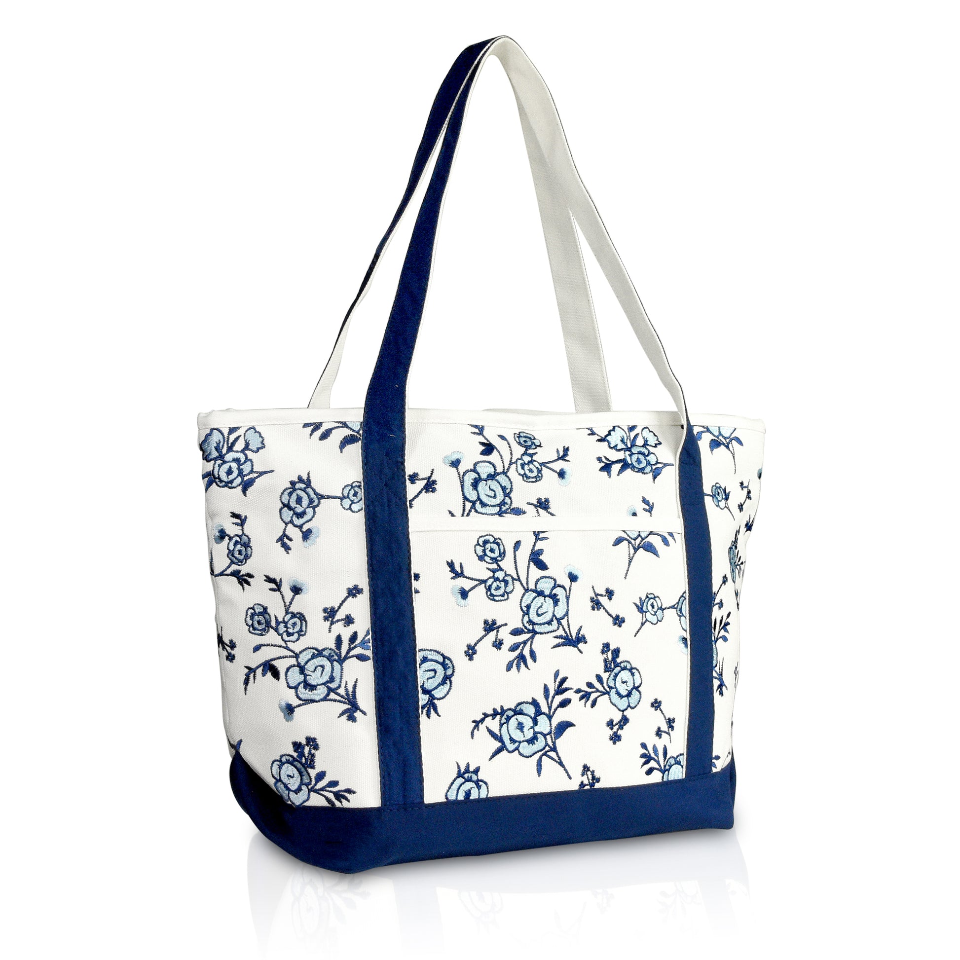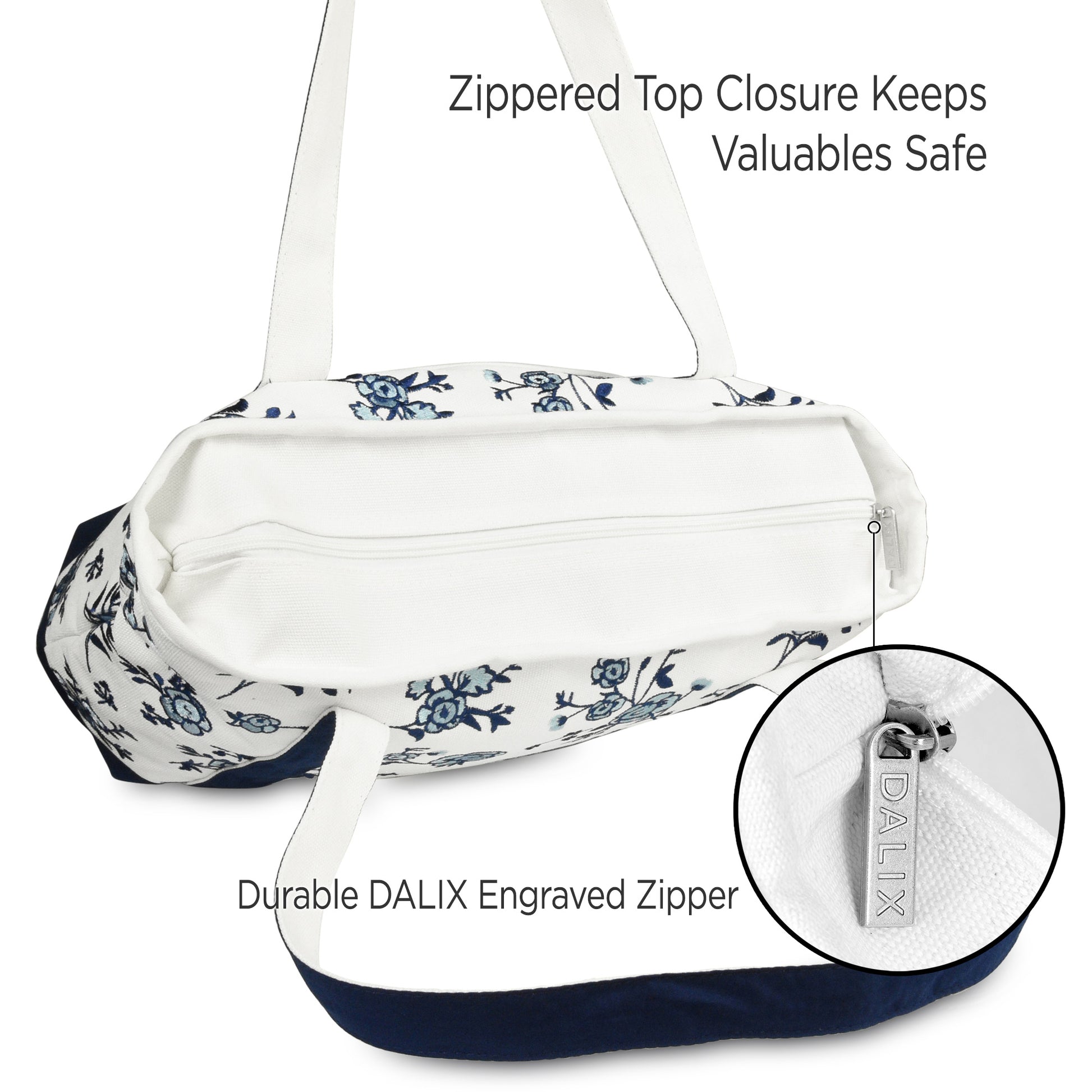 Our elegant floral tote Is the product of a fine evolution down a family line of DALIX canvas bags; resulting in a crossroads between beauty and quality. With its rich floral embroidery, blossoming with simple but extraordinary patterns, it brings the wearer into the limelight. It is perfectly suitable for a day out shopping, running errands, or visiting loved ones while affording the space for all your necessities. Not only is this tote bag light weight, it is made with a premium 100% cotton canvas (24 oz.) to withstand heavier weight and maintain its structured rigidness; allowing it to stand upright. For extra support, we have added double stitching on each strap to outlast your every use; or In the case you do end up packing more on the go, its soft straps have a 12 inch drop-length which makes this an elegant shoulder bag. The main compartment (20 inches Length x 7 inch Depth x 13 Inch Height) is generously spaced to fit all your items: featuring a soft 100% cotton inner lining to keep your items protected and clean. To help avoid the clustering disarray of all your things being stuffed in one compartment, the tote features an inner zippered pocket (7 inches Height x 6 inches Width) for valuables and keys, and we've also included a carrying pouch to help you keep organized. The carrying pouch, which displays an exquisite floral embroidery, is detachable from an inner lobster clasp keychain strap in the main compartment. And for your items' safekeeping, we've closed off the top with a fine zippered lining: smooth and easy to pull. There is also an outer front pocket compartment (8.5 inches Width x 7.5 inches Height) for easy grab-and-go storage. This tote bag is made for the everyday woman looking to enhance her wardrobe with a simplistic touch of elegance.