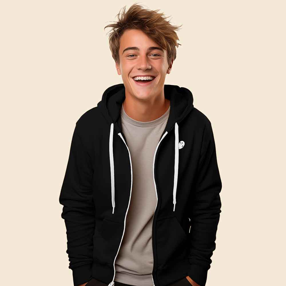 Embrace a stylish look with our men's zip hoodie featuring our Ghost embroidery, adding a touch of mystery to your wardrobe!