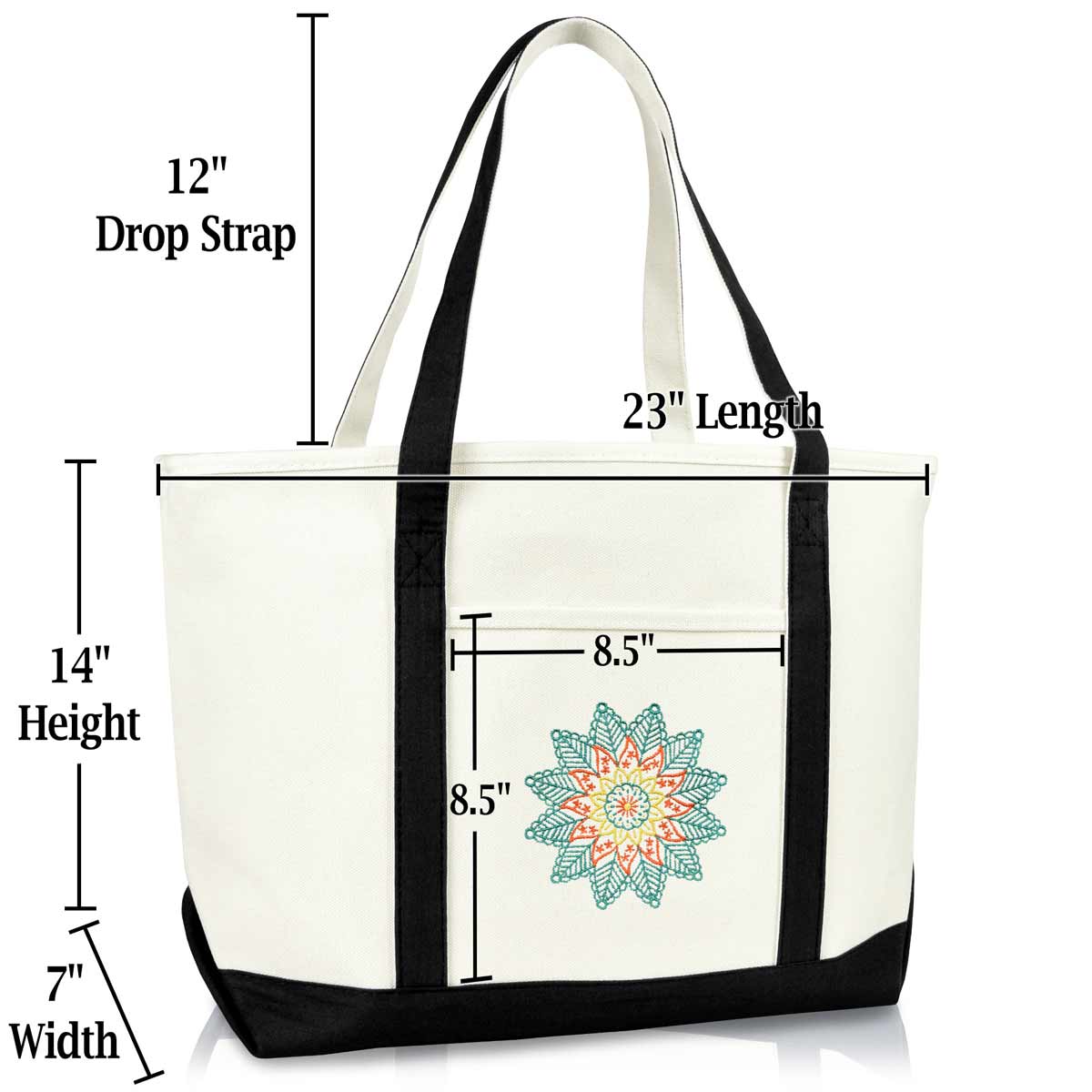 The Mandala is a spiritual and ritual symbol in Hinduism and Buddhism, representing the universe. Its circular designs symbolize the idea that life is never ending and everything is connected; a spiritual journey within the individual. The Mandala helps express your creative side and is associated with reducing stress and anxiety as well. Our custom embroidered totes use high quality threading, designed and stitched in detail for a lasting experience. Made with 100% Cotton 24 oz., heavy duty shopping tote with front open pocket, top zipper closure. The straps also feature heavy duty stitching to ensure longer carrying and No Breakage! There is also a front pocket (8.5 inch Height x 8.5 inch Width) for additional storage of larger accessories. You can also make this a shopping bag or a shoulder bag (12 inch Strap Drop Length) for your daily needs.