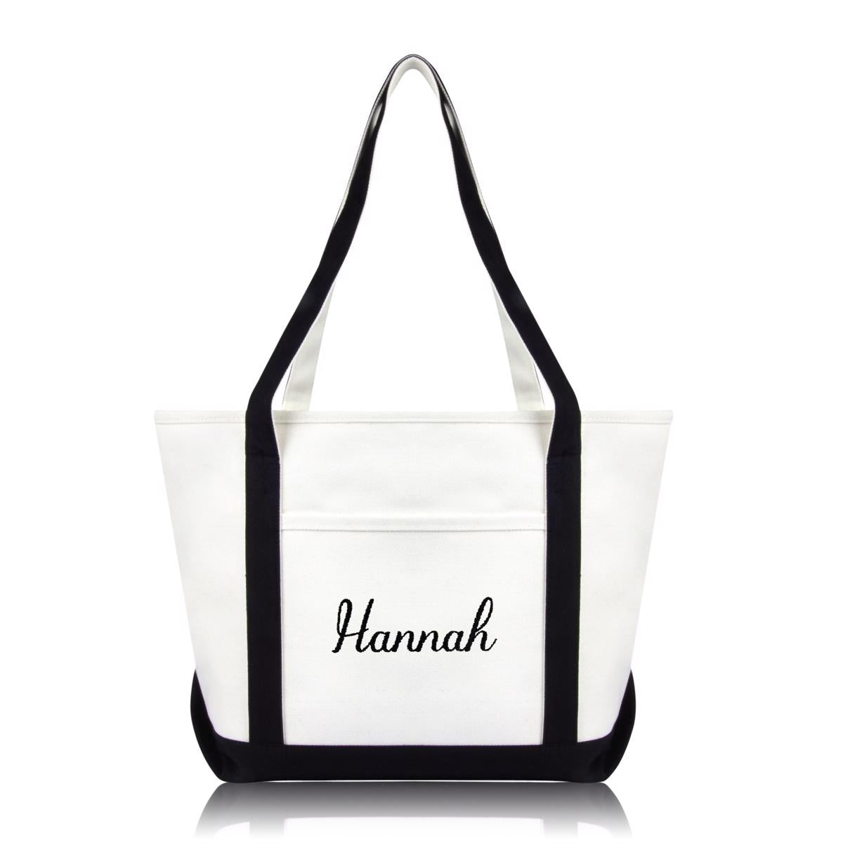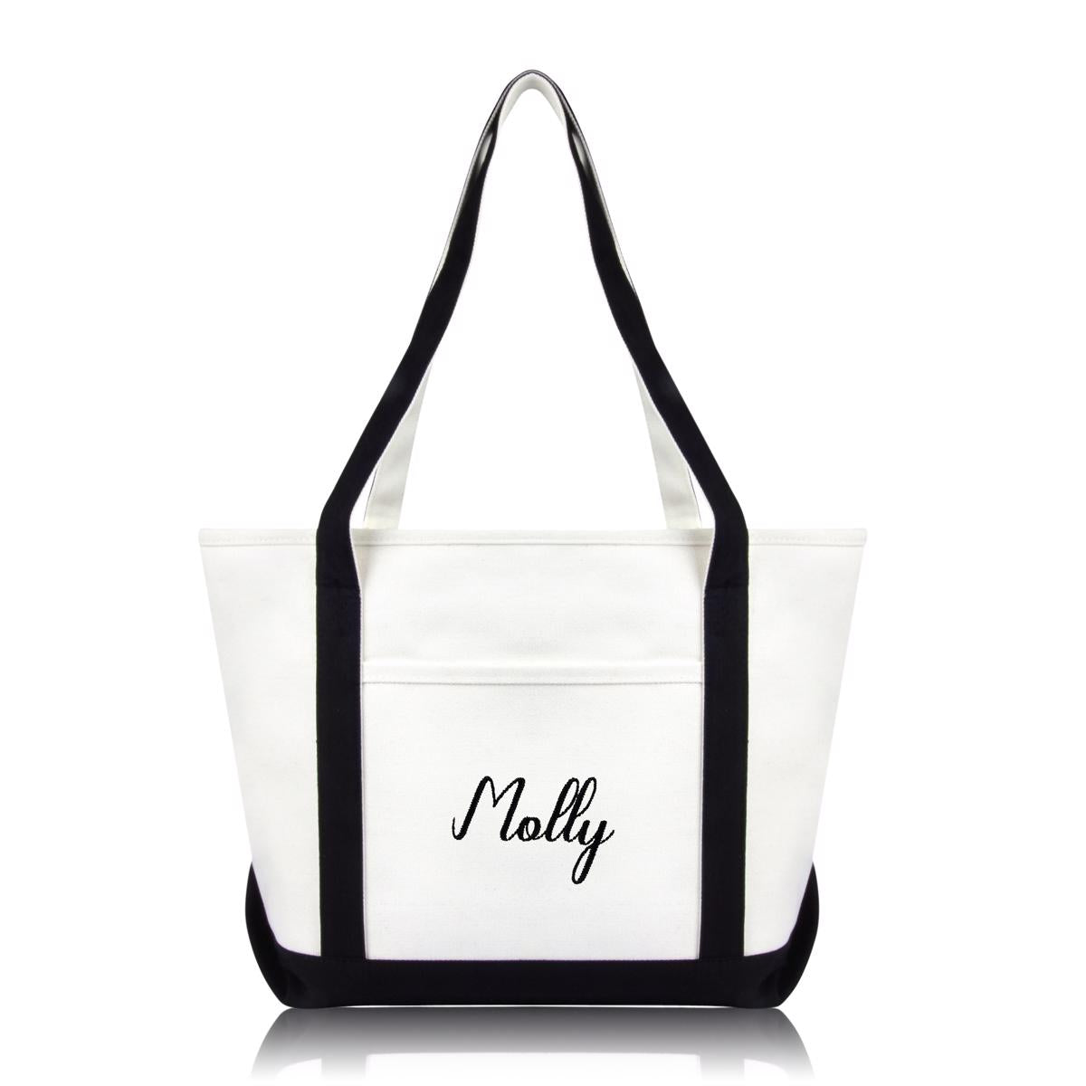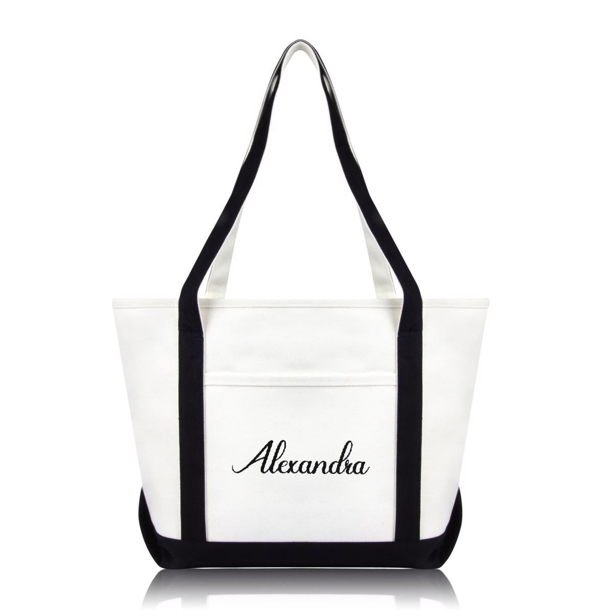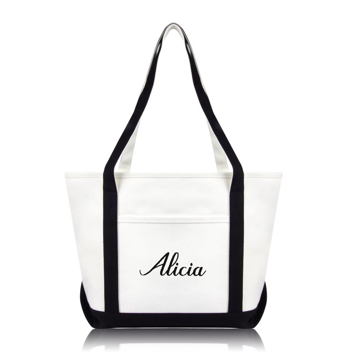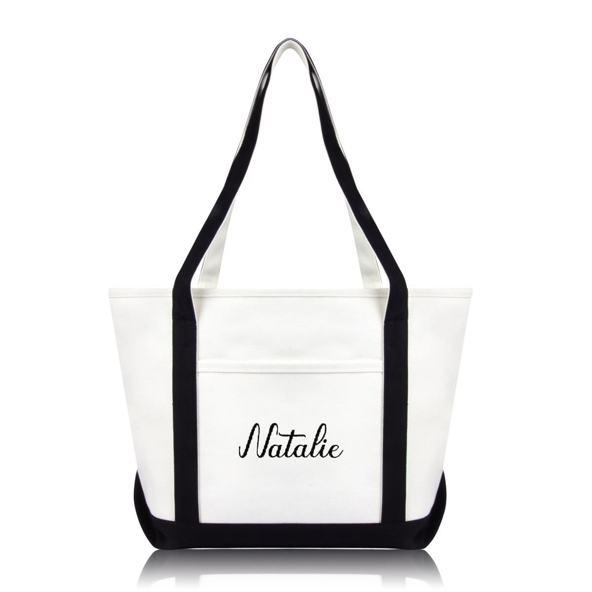 A perfect gift is usually the most useful gift: it shows the amount of thoughtfulness and attention to the important people in your life when you give them something that will help improve their day. If you know a special somebody whose name is here, you have found just the right gift for them. Our custom monogrammed tote bags features a heavy duty cotton canvas with useful unique features. Every bag is embroidered with precision, allowing you to express and impress with your name stitched elegantly. An everyday bag made for women on any occasion, this shoulder bag is generous in sizing and includes a front pocket, zippered top, an inner zippered pocket, and a special lobster clasp strap by the zipper for easy-access to your keys when you need them.